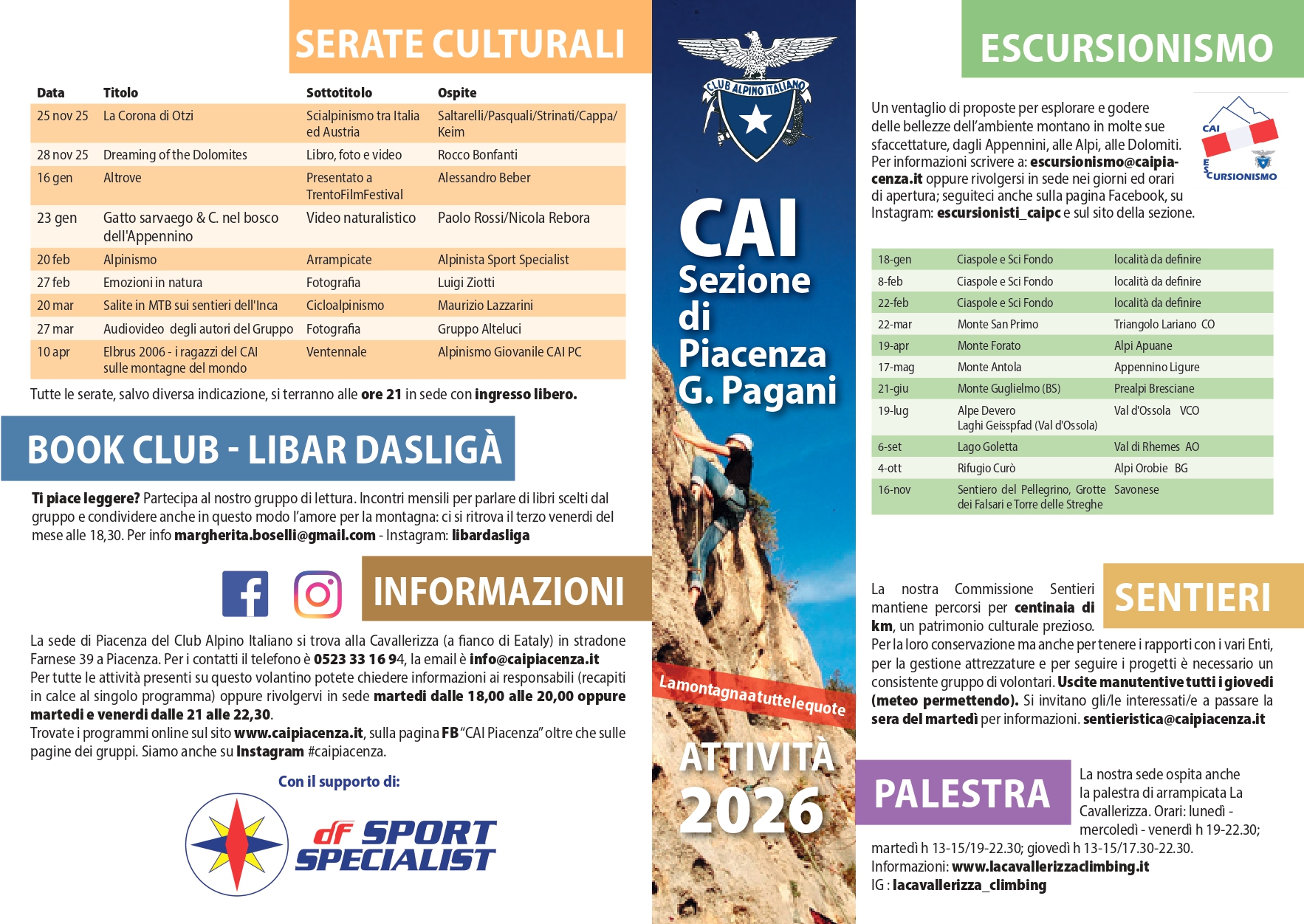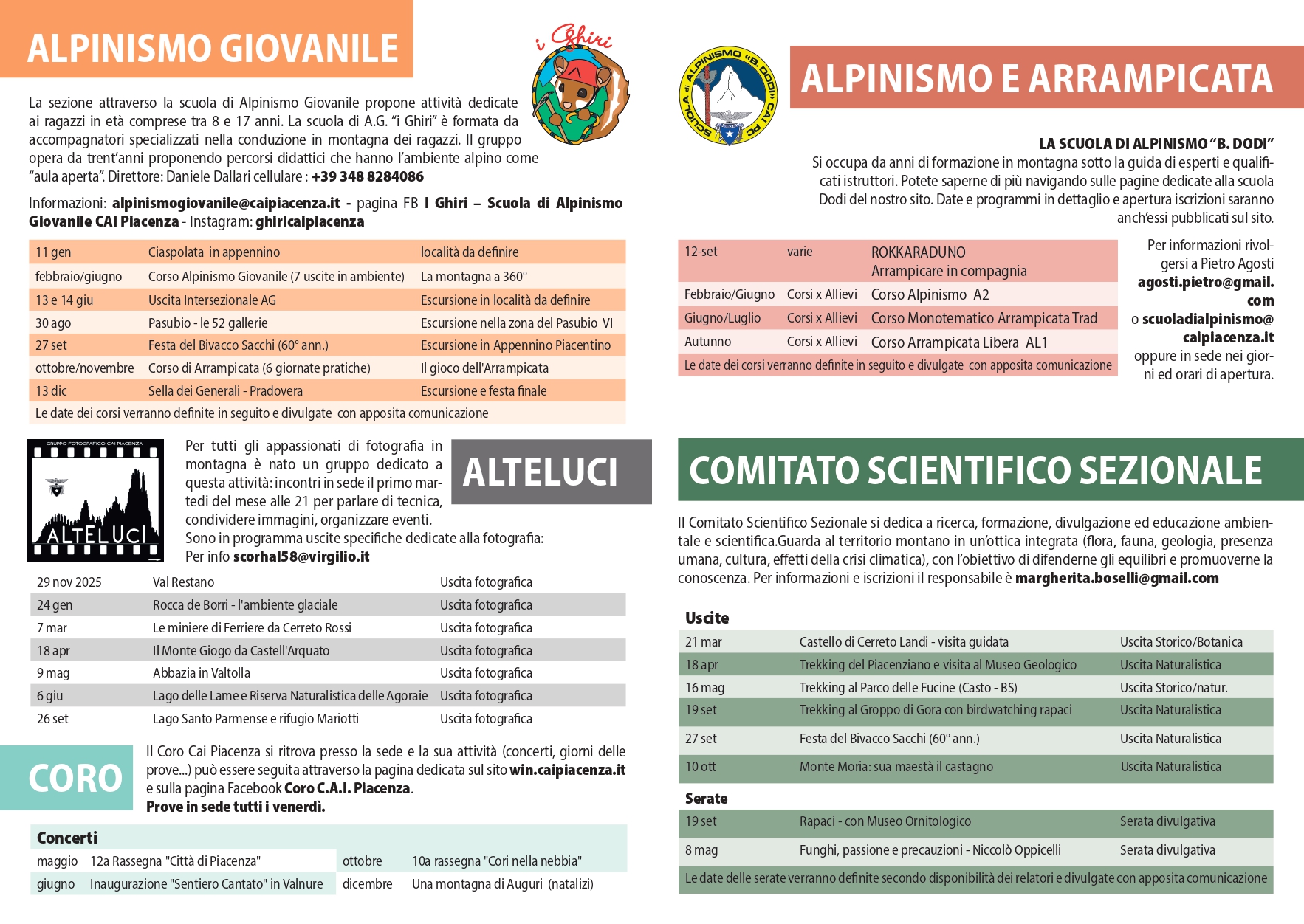 Aggiornamenti e notizie sugli eventi verranno divulgati tramite il sito e la pagina Facebook CAI Piacenza oltre che sulle pagine dei gruppi