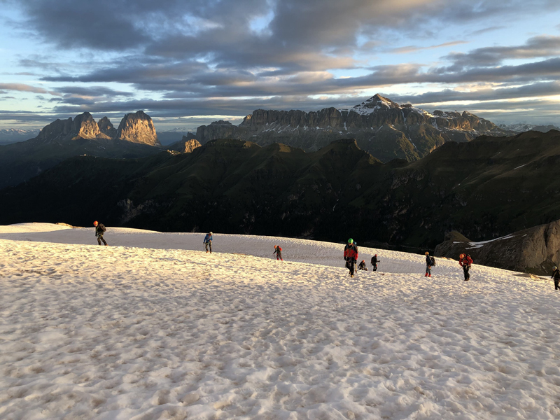 Un’avventura fantastica, difficilmente spiegabile a parole, ritrovata e condivisa negli occhi lucidi dei miei compagni ed amici sulla vetta della Marmolada all’ultima uscita. Non era il tempo splendido, né la bellezza del panorama e nemmeno il caldo inaspettato a renderci così felici ed emozionati, lo saremmo stati anche con la pioggia ed il freddo. Era la consapevolezza di aver fatto qualcosa di speciale che andava al di là dello sforzo fisico o del panorama, al di là del posto in cui ci trovavamo. Quella vetta rappresentava l’apice del nostro percorso, la somma dei momenti vissuti insieme in tutti questi mesi, degli guardi imbarazzati alla prima lezione quando ci siamo presentati ai nostri istruttori ed ai nostri compagni, della prima serata in sede quando ci hanno mostrato il materiale base per fare il corso e subito ci siamo resi conto che anche scavando nei nostri armadi non avremmo trovato nemmeno un paio di calze adatte, delle prime uscite quando abbiamo iniziato a prendere confidenza con i materiali e con le procedure di progressione su neve, scoprendo che mettersi in sicurezza con un nodo barcaiolo ad un appiglio sicuro, serve tanto in ambiente quanto a fine giornata, dove vino e la birra scorrono più velocemente di quanto non lo facessero le nostre corde poco prima, ma la necessità di un appiglio sicuro per non cadere è la stessa…