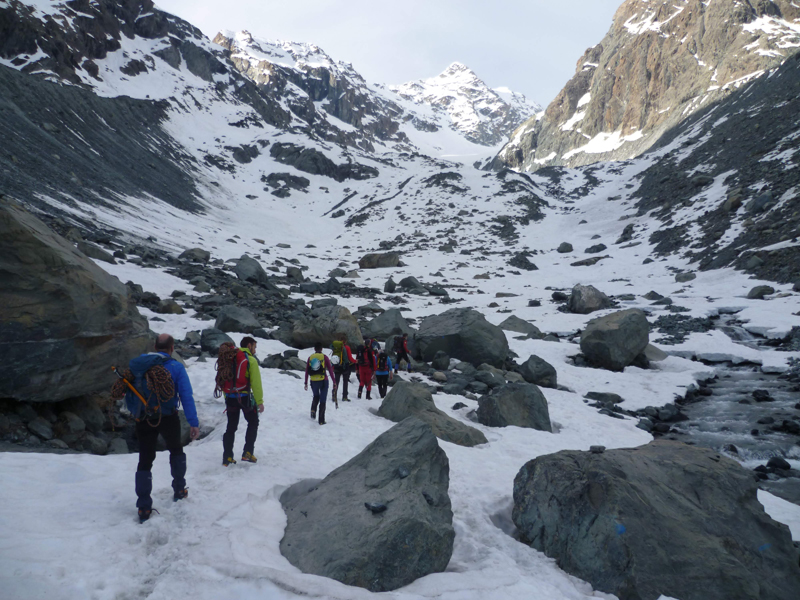 Ricordo con grande piacere il primo weekend con notte al rifugio Ventina, le difficoltà iniziate già solo facendo lo zaino. Nonostante le raccomandazioni di Lucio nel non esagerare, la sensazione di non avere tutto e quella classica ansia da alpinista inesperto alla prima uscita che ti spinge a pensare “Beh questo potrebbe servire…” e ti porta ad avere uno zaino con dentro anche la coperta di lana che nonna ti aveva regalato in terza elementare… La fatica nel salire, la bellezza selvaggia della Val Malenco, le risate nel rifugio, la notte praticamente insonne per la novità, per il compagno che russa, per qualche alpinista che parte presto, perché fa caldo con le coperte ma fa freddo senza, le trattenute su ghiaccio, le risate per il compagno che non ha trattenuto ed è stato trascinato per dieci metri, la merenda, il ritorno in pullman dormendo e cantando, cantando e dormendo….